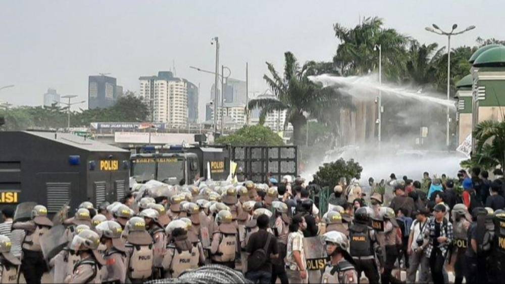 Kapolres Metro Jakarta Pusat, Kombes Susatyo, terlihat memberikan komando pembubaran aksi dari atas mobil pengurai massa. “Bapak, Ibu, aksi ini sudah tidak kondusif, banyak pelajar dan anak-anak. Kami bubarkan karena aksinya sudah tidak kondusif,” seru Susatyo.