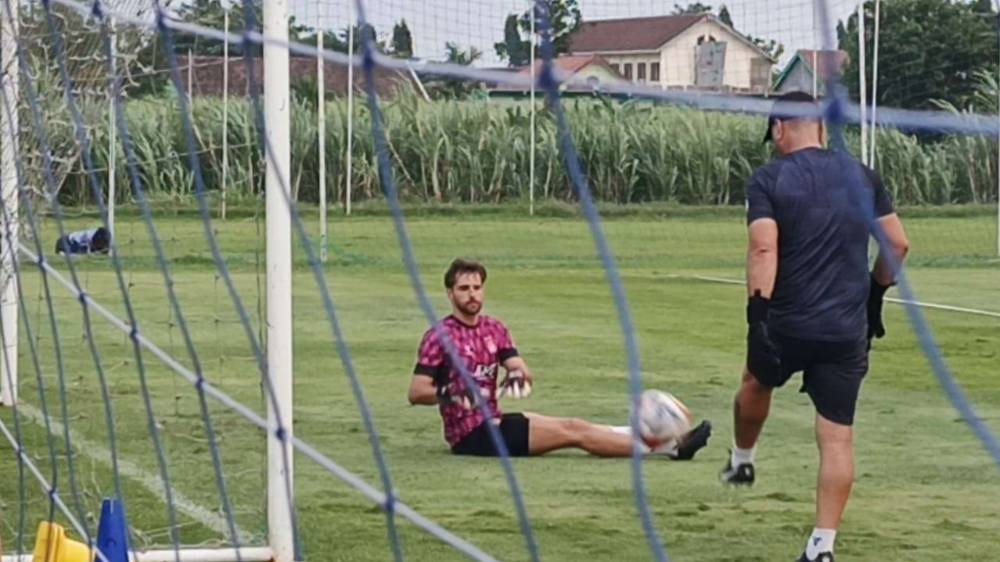 Kiper andalan Persik Kediri, Leonardo Navacchio (duduk depan gawang) berlatih bersama sejumlah pemain Persik Kediri, Selasa (7/10/2025). (Foto: Persik Kediri Official)