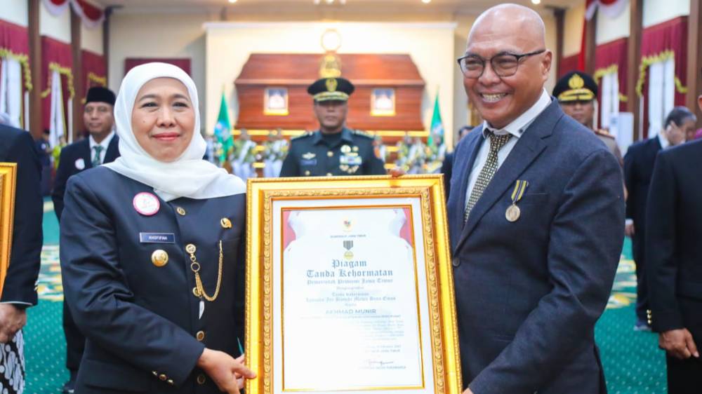 JATIM.IDNZONE.COM – Ketua Umum Persatuan Wartawan Indonesia (PWI) Pusat, Akhmad Munir, menerima Lencana Kehormatan Provinsi Jawa Timur “Jer Basuki Mawa Beya” pada puncak peringatan Hari Jadi ke-80 Provinsi Jawa Timur di Gedung Negara Grahadi, Minggu (12/10/2025). Penghargaan diberikan berdasarkan Keputusan Gubernur Jawa Timur sebagai apresiasi atas jasa dan prestasi Munir dalam memajukan pers nasional, memperkuat komunikasi publik, dan meneguhkan nilai-nilai kebangsaan, khususnya bagi masyarakat Jawa Timur.