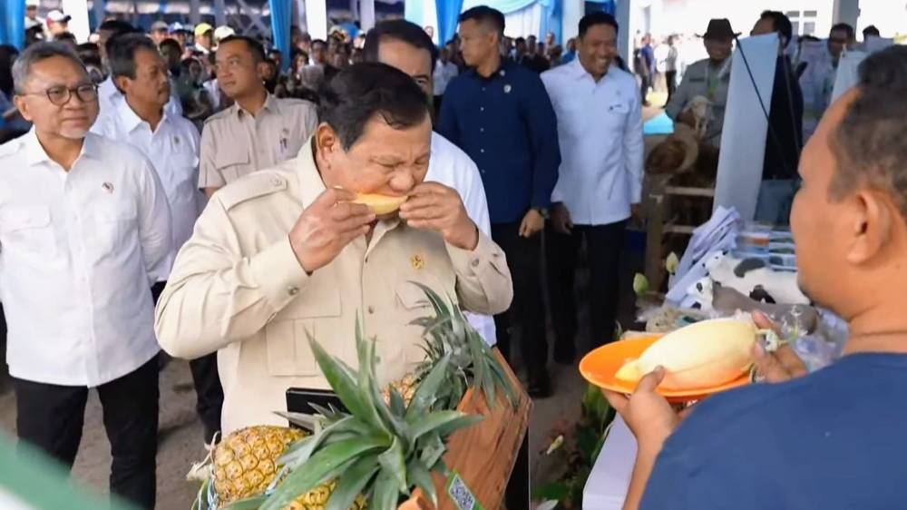 Setibanya di lokasi, Presiden Prabowo berkeliling mengunjungi sejumlah stan yang memamerkan hasil bumi nusantara. Presiden tampak antusias mencoba langsung produk pertanian, di antaranya buah menyerupai melon serta produk susu kemasan hasil produksi lokal.